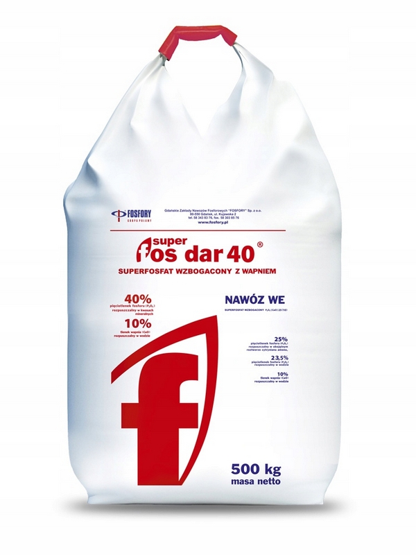 Super FOS DAR 40 - SUPERFOSFAT WZBOGACONY 40% P2O5 Jest uniwersalnym, skoncentrowanym nawozem fosforowym, który można stosować przedsiewnie, wiosną i jesienią na wszystkich glebach i pod wszystkie rośliny uprawne łącznie z użytkami zielonymi. W swoim składzie, oprócz fosforu, zawiera również wapń i siarkę. Nawóz przeznaczony jest dla roślin wymagających dobrego zaopatrzenia w fosfor, wapń i siarkę do których należą: rzepak ozimy i jary, gorczyca, kapusta, rośliny motylkowe drobnonasienne (lucerna, koniczyna), a także inne gatunki roślin np. zboża, kukurydza, ziemniaki, buraki. Zawartość w nawozie wapnia oraz siarki jest bardzo cenna również w nawożeniu użytków zielonych, ponieważ składniki te poprawiają jakość paszy dla przeżuwaczy. Ze względu na wysoką zawartość fosforu bardzo dobry do stosowania pod rośliny nawożone obornikiem, zawierającym zawsze za mało fosforu w stosunku do potasu.