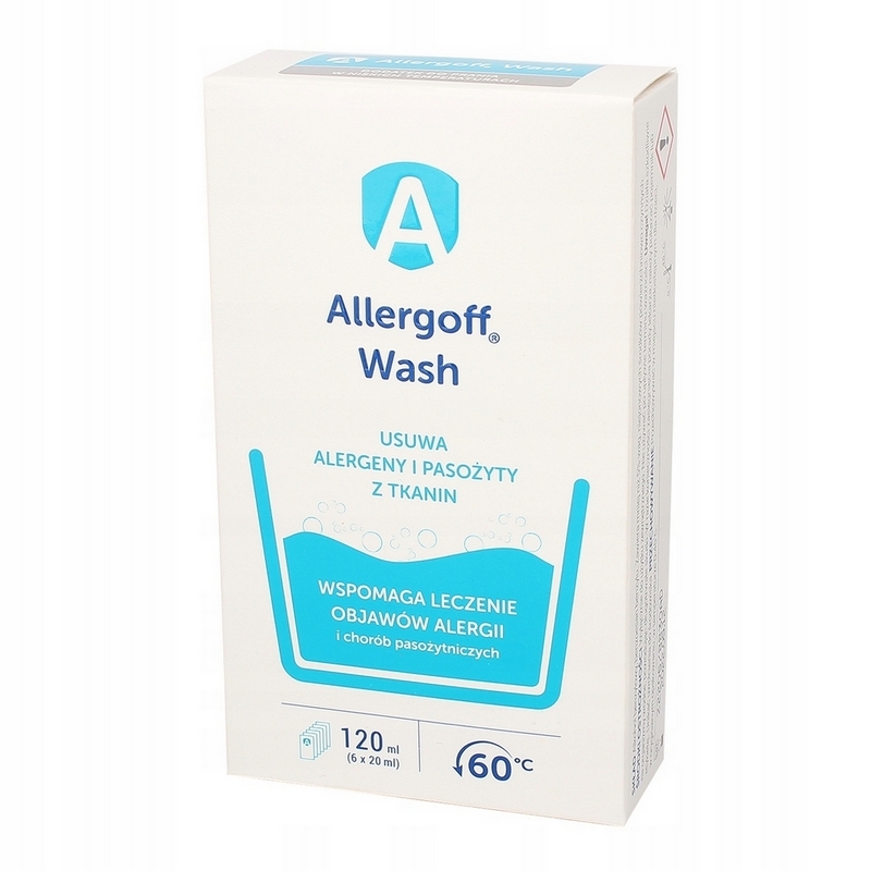 ALLERGOFF WASH w postaci wygodnych w użyciu saszetek neutralizuje alergeny wziewne (alergeny roztoczy kurzu domowego, nużeńca, owadów, alergeny zwierząt domowych, pyłki roślin itp.) podczas moczenia tkanin, które poprzedza pranie ręczne lub maszynowe w temperaturze poniżej 60*C. Zalecany do stosowania podczas terapii chorób pasożytniczych skóry powodowanych przez świerzbowca i nużeńca, jak i do stosowania w szpitalach, noclegowniach i sanatoriach w celu eliminacji czynników zagrożeń biologicznych w warunkach podwyższonych wymagań higieniczno-sanitarnych. Dodatek do prania ALLERGOFF WASH ułatwia fizyczną eliminację pasożytów obecnych w tkaninach (pchły, kleszcze, wszy, pluskwa domowa).