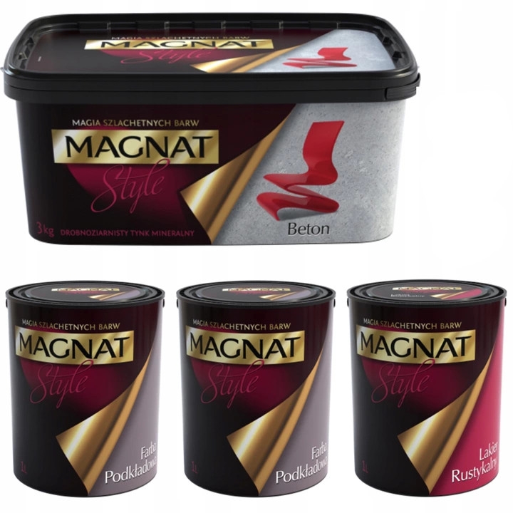 Beton MAGNAT Style to drobnoziarnisty, zabarwiony tynk mineralny wyprodukowany na bazie spoiwa wapiennego, występujący w formie sypkiej. Odpowiednia aplikacja produktu pozwala uzyskać doskonały efekt naturalnego „surowego” betonu z jego charakterystycznymi przebarwieniami, jak również efekt: deskowania, stalowej formy, gładki czy lity z charakterystycznymi wżerami i ubytkami. Beton to modny artystyczny efekt stanowiący wysublimowaną dekorację nowoczesnych wnętrz, doskonale harmonizującą z metalem, szkłem i surowym drewnem. Polecany jest do dekoracji wnętrz mieszkalnych i użyteczności publiczne