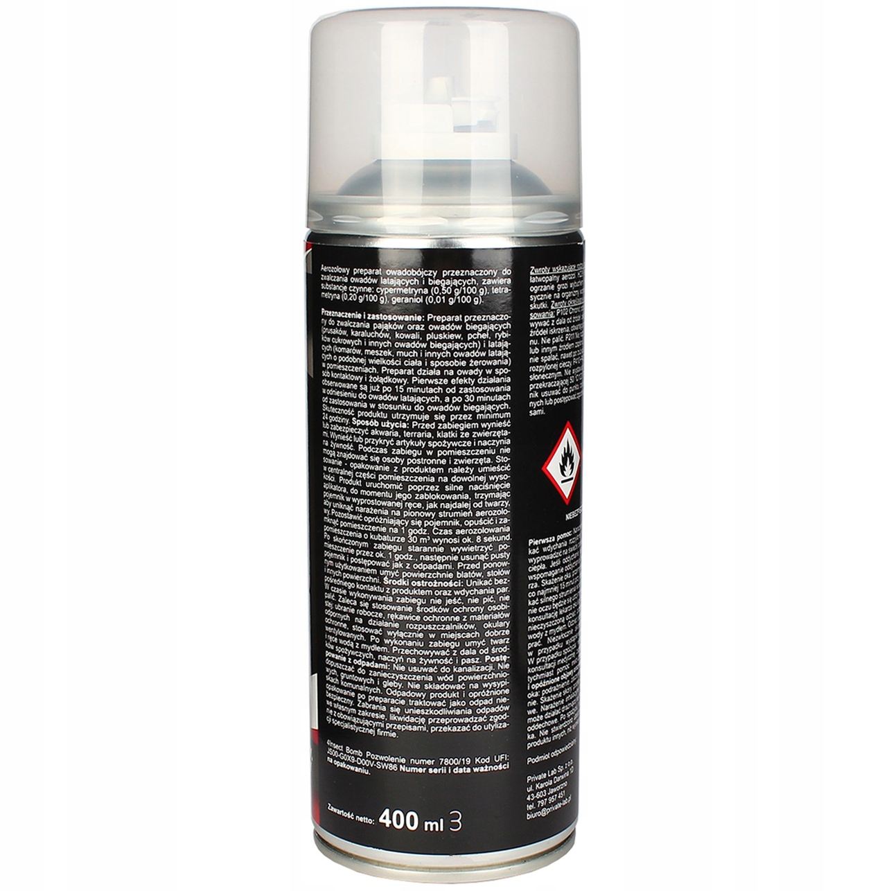 skład: cypermetryna 0,5 g/100 g, tetrametryna 0,2 g/100 g, geraniol 0,01 g/100 g