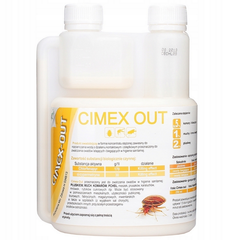 CIMEX-OUT to produkt owadobójczy w formie koncentratu stężonej zawiesiny do rozcieńczania wodą. Produkt o działaniu kontaktowym i żołądkowym przeznaczony do zwalczania owadów latających i biegających w higienie sanitarnej: much, komarów, meszek, prusaków, karaluchów, pluskiew, mrówek faraona, rybików cukrowych itp. Produkt powoduje śmiertelność owadów biegających po upływie ok. 1,5-4 godzin i owadów latających po upływie ok. 20-40 minut od zastosowania.
