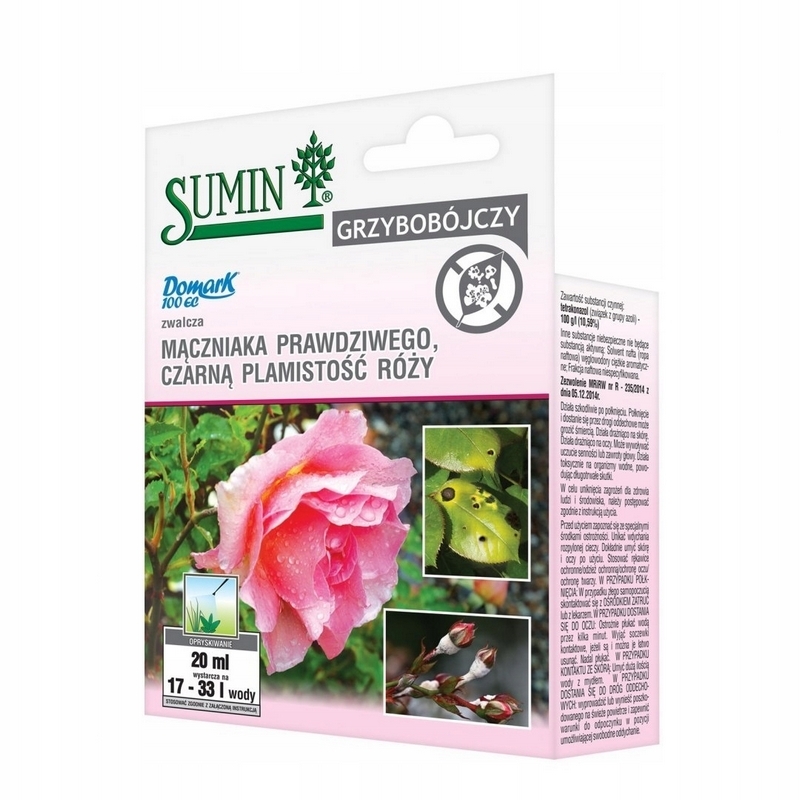 - rośliny ozdobne w gruncie: mączniak prawdziwy roślin ozdobnych.0,05% (5ml/10L wody) /4-6L cieczy użytkowej 100m2, okres karencji: nie dotyczy