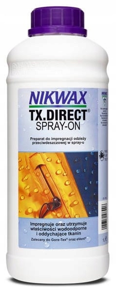 Impregnat NIKWAX TX Direct Spray-On 1L - zapas uzupełniający do butelek o pojemności 300ml oraz 500ml. Do impregnacji odzieży membranowej, oddychającej, wodoodpornej. UWAGA! Opakowanie uzupełniające nie posiada w wyposażeniu spryskiwacza.