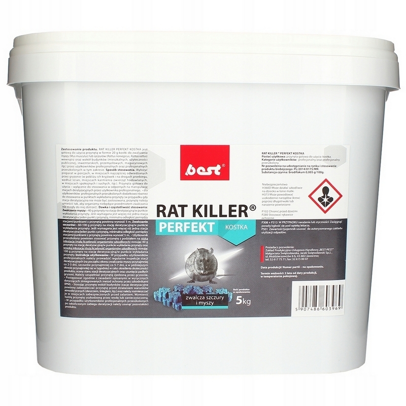 Przynęta BEST RAT KILLER PERFEKT przeznaczona do użytku w pomieszczeniach (lokalach użyteczności publicznej, hotelach, mieszkaniach, zakładach produkcyjnych, magazynach, obiektach handlowych i inwentarskich, oborach, chlewniach, mleczarniach itp.) oraz na zewnątrz - w bezpośrednim ich sąsiedztwie, po umieszczeniu jej w stacji deratyzacyjnej.