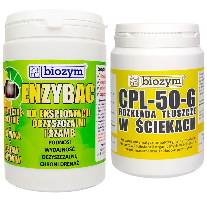 Preparat bakteryjno-enzymatyczny do oczyszczalni i szamb Enzybac 1kg + biologiczny odtłuszczacz Biozym CPL-50-G 0,5kg