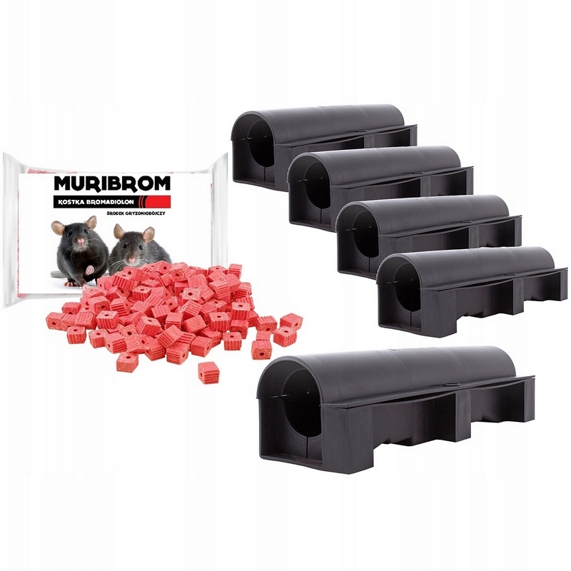 ZESTAW NA MYSZY I SZCZURY: 5x RAT BAIT TUNNEL duża i wytrzymała stacja deratyzacyjna + MURIBROM gotowa do użycia kostka BROMADIOLON 1 kg