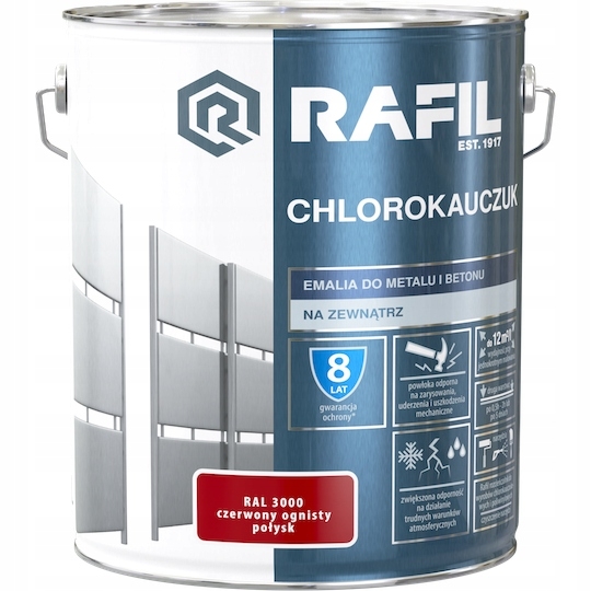 Emalia Rafil CHLOROKAUCZUK przeznaczona jest do ochronno-dekoracyjnego malowania powierzchni stalowych, żeliwnych i betonowych eksploatowanych na zewnątrz pomieszczeń. Tworzy trwałą i elastyczną powłokę, odporną na zarysowania, uderzenia i uszkodzenia mechaniczne. Charakteryzuje się zwiększoną odpornością na działanie trudnych warunków atmosferycznych. Zapewnia długotrwałą ochronę antykorozyjną malowanych powierzchni metalowych w zestawieniu z Rafil PODKŁAD CHLOROKAUCZUKOWY. Podłoża betonowe nie wymagają zastosowania podkładu przed nałożeniem emalii Rafil CHLOROKAUCZUK.