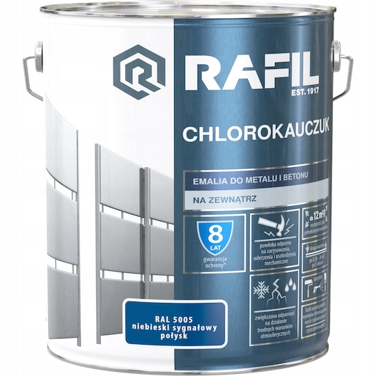 Emalia Rafil CHLOROKAUCZUK przeznaczona jest do ochronno-dekoracyjnego malowania powierzchni stalowych, żeliwnych i betonowych eksploatowanych na zewnątrz pomieszczeń. Tworzy trwałą i elastyczną powłokę, odporną na zarysowania, uderzenia i uszkodzenia mechaniczne. Charakteryzuje się zwiększoną odpornością na działanie trudnych warunków atmosferycznych. Zapewnia długotrwałą ochronę antykorozyjną malowanych powierzchni metalowych w zestawieniu z Rafil PODKŁAD CHLOROKAUCZUKOWY. Podłoża betonowe nie wymagają zastosowania podkładu przed nałożeniem emalii Rafil CHLOROKAUCZUK.