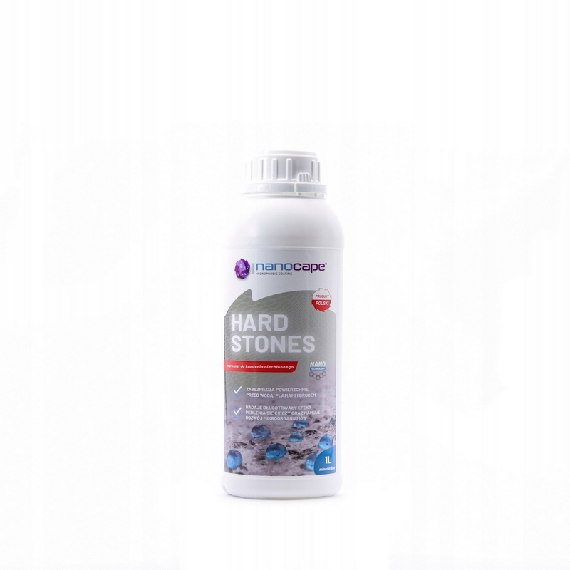 NANOCAPE® HARD STONES - Produkt jest impregnatem przeznaczonym do zabezpieczania i impregnacji mało chłonnych powierzchni mineralnych tj. klinkieru, nieszkliwionej ceramiki, nieszkliwionego gresu, dachówki ceramicznej, cegły, granitu matowego, itp. Dzięki odpowiednio dobranym składnikom i nanocząsteczkom impregnat wiąże się zarówno na powierzchni, jak i wnika w głąb do kilku milimetrów.Nie zawiera silikonu, żywicy czy polimerów, dzięki czemu wykazuję pełną odporność na zmiany temperatur, promieniowanie UV oraz działanie związków chemicznych. Ochrona powierzchni polega na skutecznym zabezpieczeniu przed brudzeniem oraz powstawaniem plam natomiast wnikanie w głąb chroni materię przed zamarzaniem i rozmarzaniem wilgoci wewnątrz, przez co zapobiega erozji. Większość zabrudzeń wymywana jest przez opady deszczu, a okresowe czyszczenie zalecane jest przy pomocy samej wody lub wody pod ciśnieniem. Stosowanie preparatu w znacznym stopniu przedłuża estetykę oraz żywotność impregnowanych powierzchni.
