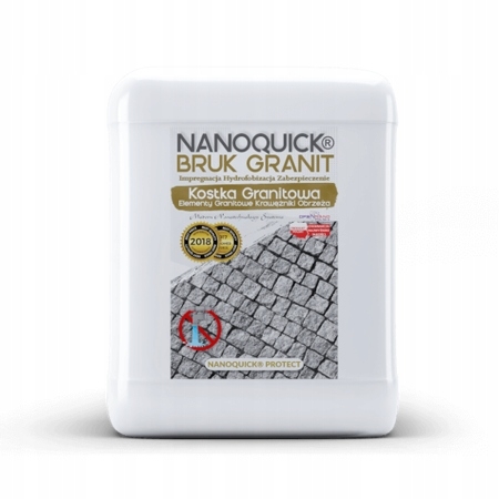 Impregnat NANOQUICK® Bruk Granit przeznaczony do kostek brukowych wykonanych z granitów. Środek zapobiega zabrudzeniom materiału oraz redukuje proces wzrostu mchów. Wzmacnia materiał, a dzięki hydrofobowej ochronie zmniejsza ryzyko korozji materiału. NANOQUICK® Bruk Granit przez długi czas impregnuje materiał, wzmacniając jego strukturę oraz nadając mu właściwości hydrofobowe. Produkt jest bezpieczny dla materiału i nie pozostawia na nim widocznej warstwy. Nie zawiera wosków, silikonów ani żywic, a także pozostawia naturalną paroprzepuszczalność materiału. Produkt z zastosowaniem formuły NANOQUICK® PROTECT. Produkt dedykowany do kostek brukowych wykonanych z granitu łupanego oraz ciętego, wykorzystywanego na podłożach, drogach i ścieżkach chodnikowych. Wydajność: 0,12-0,18 l/m².