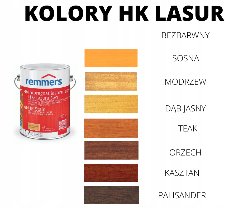 Lazura Remmers 3w1 występuje w wielu kolorach. Należy jednak mieć na uwadze, iż finalny odcień różnił się będzie w zależności o rodzaju i stanu drewna.