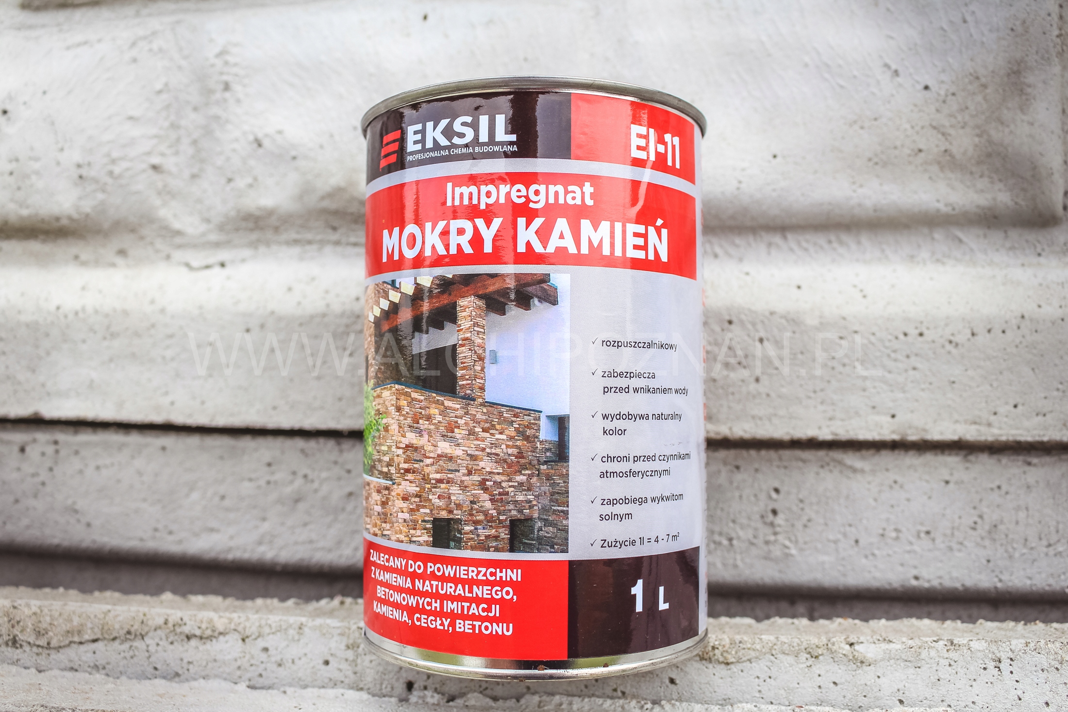 Opakowanie zawiera 1 l impregnatu rozpuszczalnikowego „Mokry kamień” EL-11 marki EKSIL.