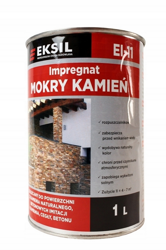 Rozpuszczalnikowy impregnat „Mokry kamień” EL-11 jest wykorzystywany do impregnacji powierzchni z naturalnego kamienia, betonu, piaskowca, cegły, gipsu oraz kostki brukowej. Preparat tworzy satynową powłokę z efektem „mokrego kamienia”. Chroni powierzchnię przed negatywnym działaniem wody, zabrudzeniami oraz warunkami atmosferycznymi.