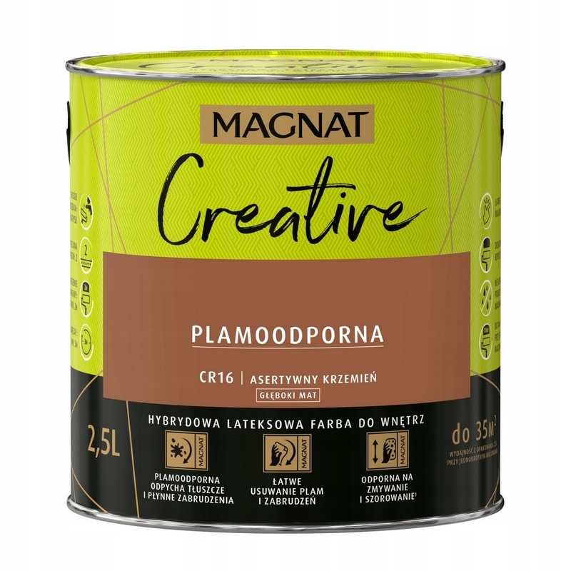 - MAGNAT CREATIVE to farba hybrydowa, łącząca ze sobą dwie właściwości: odporność na płynne zabrudzenia (hydrofobowość) oraz odporność na tłuszcze (oleofobowość). Farba przeznaczona jest do dekoracyjnoochronnego malowania ścian i sufitów z zapraw cementowych, cementowowapiennych, gipsowych, cegły, płyt gipsowokartonowych, drewnianych, drewnopochodnych oraz tapet, również tych z włókna szklanego użytkowanych wewnątrz pomieszczeń.