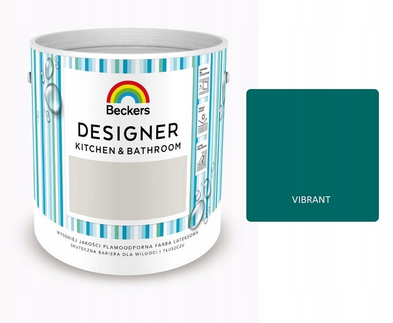 Przeznaczona do dekoracyjnego malowania ścian i sufitów wewnątrz pomieszczeń mieszkalnych, użyteczności publicznej: w tym w obiektach szkolno-wychowawczych i służby zdrowia; zakładach usługowych i produkcyjnych, w tym branży spożywczej bez bezpośredniego kontaktu z żywnością. Malowanie tynków cementowo-wapiennych, podłoży betonowych (tylko jako dekoracja), płyt gipsowo-kartonowych (suchych tynków), tapet z włókna szklanego. Można również używać do malowania drobnych elementów wykończeniowych drewnianych, drewnopochodnych lub metalowych, jako uzupełnienie koloru przy malowaniu ścian, po uprzednim zagruntowaniu podkładem do drewna (elementy drewniane i drewnopochodne), podkładem antykorozyjnym (elementy metalowe). BECKERS DESIGNER KITCHEN & BATHROOM może być również stosowana do renowacji powierzchni uprzednio malowanych farbami wodorozcieńczalnymi lub alkidowymi.