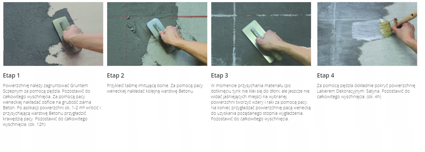Tynkowanie: Przed przystąpieniem do pracy należy zaplanować kolejność i sposób nakładania warstw oraz sprawdzić ostateczny efekt na małej próbce! Tynk należy nakładać w dwóch warstwach. Pierwszą warstwę nałożyć pacą ze stali nierdzewnej na gładko, na grubość ziarna i pozostawić do całkowitego wyschnięcia (12 – 24h, zależnie od klimatu panującego w pomieszczeniu). Przed nałożeniem drugiej warstwy tynku całą dekorowaną powierzchnię należy delikatnie zwilżyć wodą. Drugą warstwę tynku nałożyć na całą dekorowaną powierzchnię i wyrównać. W fazie wysychania należy zagładzać tynk przyłożonym płasko brzegiem pacy. Przy zagładzaniu pory tynku zamykają się i powierzchnia otrzymuje charakterystyczną gładkość. W zależności od sposobu wykończenia (delikatne lub intensywne wielokrotne wybłyszczanie pacą), można uzyskać gładką, matową lub satynowo błyszczącą powierzchnię Pojedyncze rozsiane ubytki i wżery dodają uroku betonowej powierzchni. Należy pamiętać, aby w czasie pracy utrzymywać ostrze pacy w idealnej czystości.