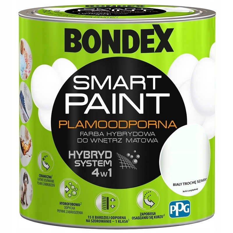 Bondex Smart Paint to najwyższej jakości plamoodporna farba hybrydowa o matowym efekcie wykończenia z innowacyjną formułą HYBRYD SYSTEM 4w1. Synergiczne połączenie wysokogatunkowej dyspersji akrylowej, wysokiej jakości wosków i kombinacji innowacyjnych wypełniaczy sferycznych zapewnia ponadprzeciętne właściwości aplikacyjne i użytkowe oraz niespotykaną odporność na zabrudzenia i plamy.