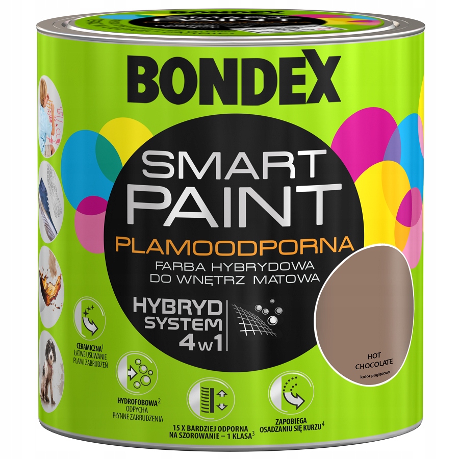 Bondex Smart Paint to najwyższej jakości plamoodporna farba hybrydowa o matowym efekcie wykończenia z innowacyjną formułą HYBRYD SYSTEM 4w1. Synergiczne połączenie wysokogatunkowej dyspersji akrylowej, wysokiej jakości wosków i kombinacji innowacyjnych wypełniaczy sferycznych zapewnia ponadprzeciętne właściwości aplikacyjne i użytkowe oraz niespotykaną odporność na zabrudzenia i plamy.