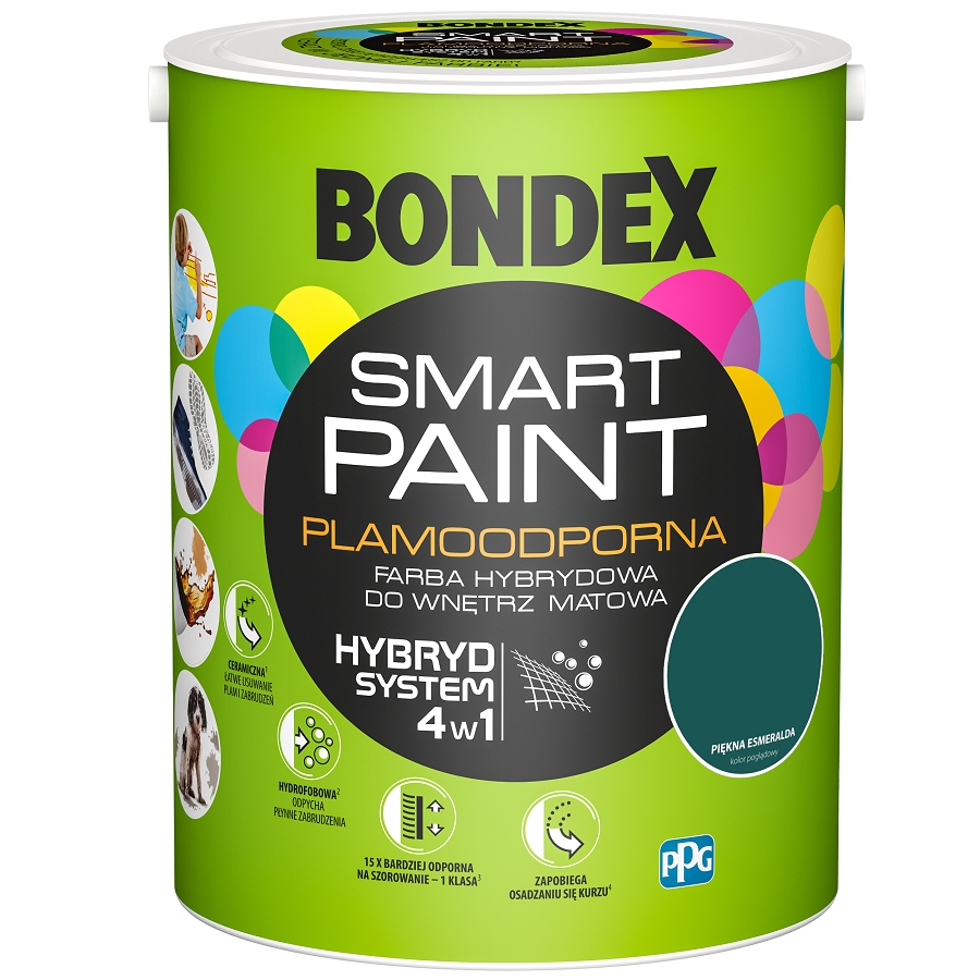 Bondex Smart Paint to najwyższej jakości plamoodporna farba hybrydowa o matowym efekcie wykończenia z innowacyjną formułą HYBRYD SYSTEM 4w1. Synergiczne połączenie wysokogatunkowej dyspersji akrylowej, wysokiej jakości wosków i kombinacji innowacyjnych wypełniaczy sferycznych zapewnia ponadprzeciętne właściwości aplikacyjne i użytkowe oraz niespotykaną odporność na zabrudzenia i plamy.