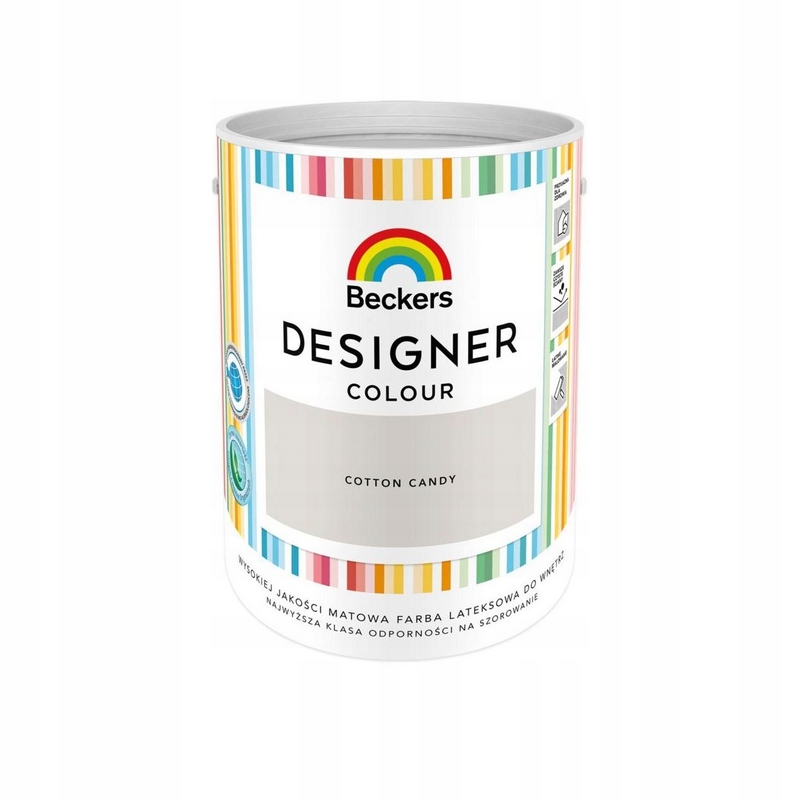 Emulsja marki Beckers z serii Designer Colour w kolorze cotton candy to wysokiej jakości, wodorozcieńczalna farba lateksowa. Przeznaczona jest do malowania ścian i sufitów. Wydziela nieznaczny zapach podczas aplikacji i schnięcia. Daje piękny efekt matowego wykończenia. Tworzy powłokę odporną na mycie wodą z dodatkiem detergentu. Farbę bardzo łatwo się nakłada. Wyróżnia się dobrym kryciem i trwałością koloru. Jest wysoce wydajna, 1 l farby pozwala na pomalowanie do 16 m2 powierzchni.