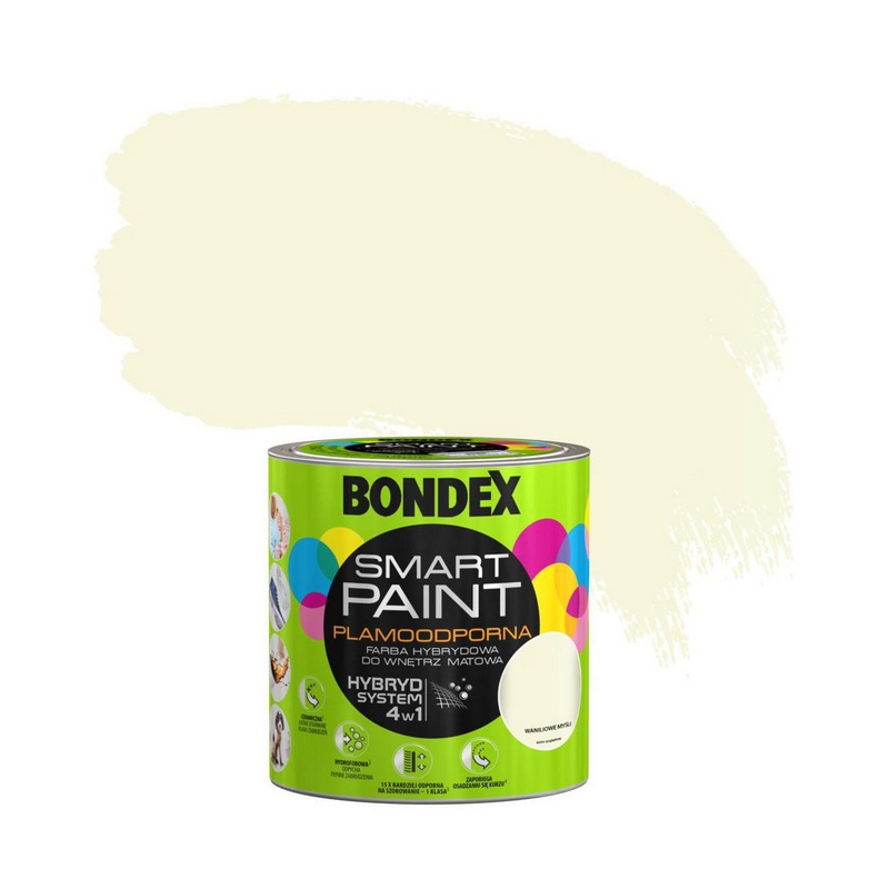 Produkt Bondex Smart Paint to najwyższej jakości plamoodporna farba hybrydowa o matowym efekcie wykończenia z innowacyjną formułą HYBRYD SYSTEM 4w1. Synergiczne połączenie wysokogatunkowej dyspersji akrylowej, nieprzeciętnej jakości wosków i kombinacji innowacyjnych wypełniaczy sferycznych zapewnia ogromne właściwości aplikacyjne i użytkowe oraz niespotykaną odporność na zabrudzenia i plamy. Zalety farby BONDEX SMART PAINT trwała i odporna powłoka, nie absorbuje plam i zabrudzeń hydrofobowość 15x bardziej odporna na zmywanie i szorowanie niż farby standardowe klasa 1 odporności doskonała aplikacja wyjątkowa trwałość koloru.