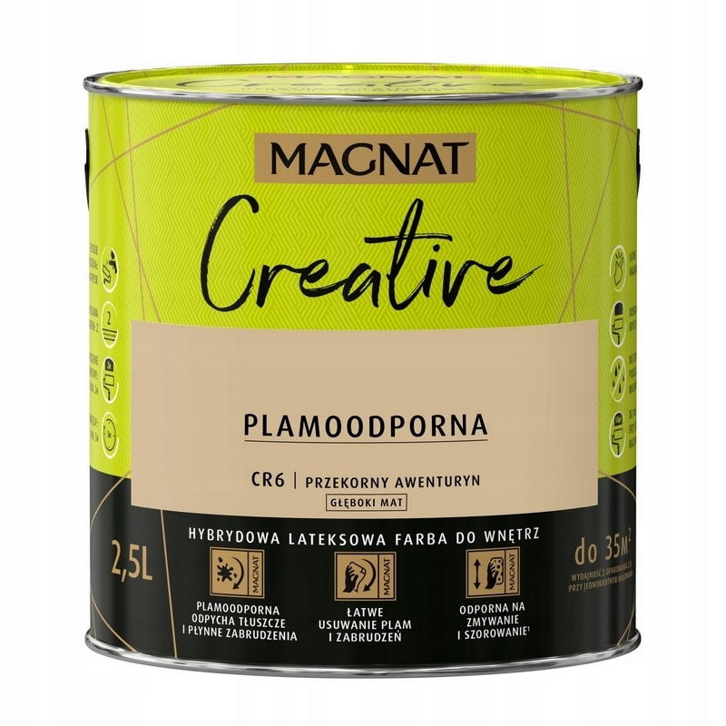 - MAGNAT CREATIVE to farba hybrydowa, łącząca ze sobą dwie właściwości: odporność na płynne zabrudzenia (hydrofobowość) oraz odporność na tłuszcze (oleofobowość). Farba przeznaczona jest do dekoracyjnoochronnego malowania ścian i sufitów z zapraw cementowych, cementowowapiennych, gipsowych, cegły, płyt gipsowokartonowych, drewnianych, drewnopochodnych oraz tapet, również tych z włókna szklanego użytkowanych wewnątrz pomieszczeń.