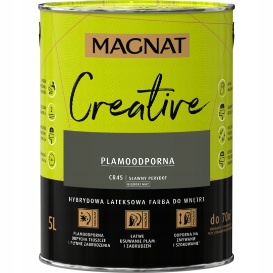 MAGNAT CREATIVE to farba hybrydowa, łącząca ze sobą dwie właściwości: odporność na płynne zabrudzenia (hydrofobowość ) oraz odporność na tłuszcze (oleofobowość). Głęboko matowe wykończenie podkreśla głębię koloru, ale oznacza również antyrefleksyjność farby. Farba przeznaczona jest do dekoracyjno-ochronnego malowania ścian i sufitów z zapraw cementowych, cementowo-wapiennych, gipsowych, cegły, płyt gipsowo-kartonowych, drewnianych, drewnopochodnych oraz tapet, również tych z włókna szklanego użytkowanych wewnątrz pomieszczeń.