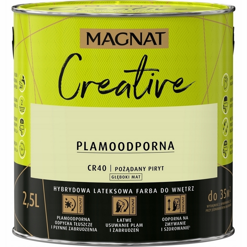MAGNAT CREATIVE to farba hybrydowa, łącząca ze sobą dwie właściwości: odporność na płynne zabrudzenia (hydrofobowość ) oraz odporność na tłuszcze (oleofobowość). Głęboko matowe wykończenie podkreśla głębię koloru, ale oznacza również antyrefleksyjność farby. Farba przeznaczona jest do dekoracyjno-ochronnego malowania ścian i sufitów z zapraw cementowych, cementowo-wapiennych, gipsowych, cegły, płyt gipsowo-kartonowych, drewnianych, drewnopochodnych oraz tapet, również tych z włókna szklanego użytkowanych wewnątrz pomieszczeń.