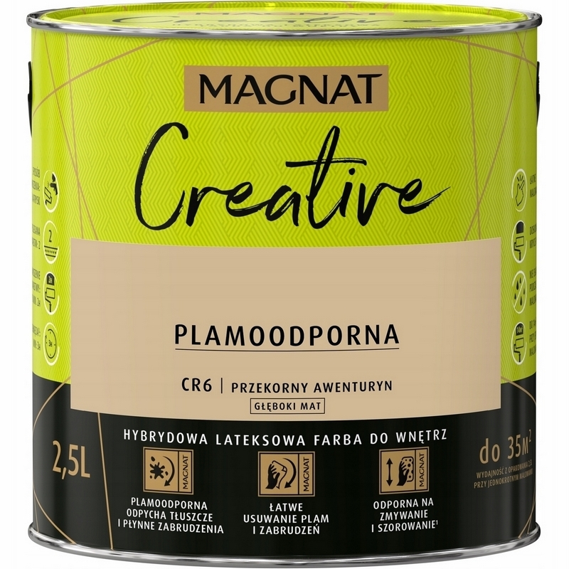 MAGNAT CREATIVE to farba hybrydowa, łącząca ze sobą dwie właściwości: odporność na płynne zabrudzenia (hydrofobowość ) oraz odporność na tłuszcze (oleofobowość). Głęboko matowe wykończenie podkreśla głębię koloru, ale oznacza również antyrefleksyjność farby. Farba przeznaczona jest do dekoracyjno-ochronnego malowania ścian i sufitów z zapraw cementowych, cementowo-wapiennych, gipsowych, cegły, płyt gipsowo-kartonowych, drewnianych, drewnopochodnych oraz tapet, również tych z włókna szklanego użytkowanych wewnątrz pomieszczeń.