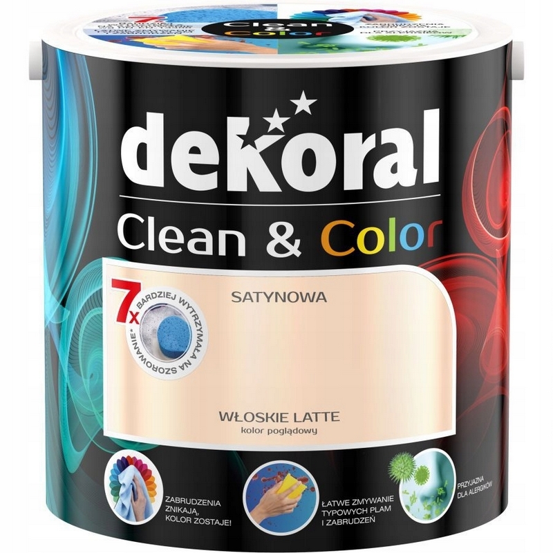 Farba Dekoral z serii CLEAN&COLOR to produkt przeznaczony głównie do użytku wewnętrznego, w ramach dekoracyjnego malowania ścian. Satynowe farby lateksowe z tej serii to świetny wybór do każdego wnętrza, dający niepowtarzalny efekt, dzięki bogatej kompozycji barw. Zaletą farby jest przede wszystkim to, że jest 7x bardziej wytrzymała niż standardowe farby. Dodatkowo charakteryzuje ją łatwość usuwania powstałych zabrudzeń, przyjazna alergikom, doskonałe krycie powierzchni oraz wysoka odporność na szorowanie.