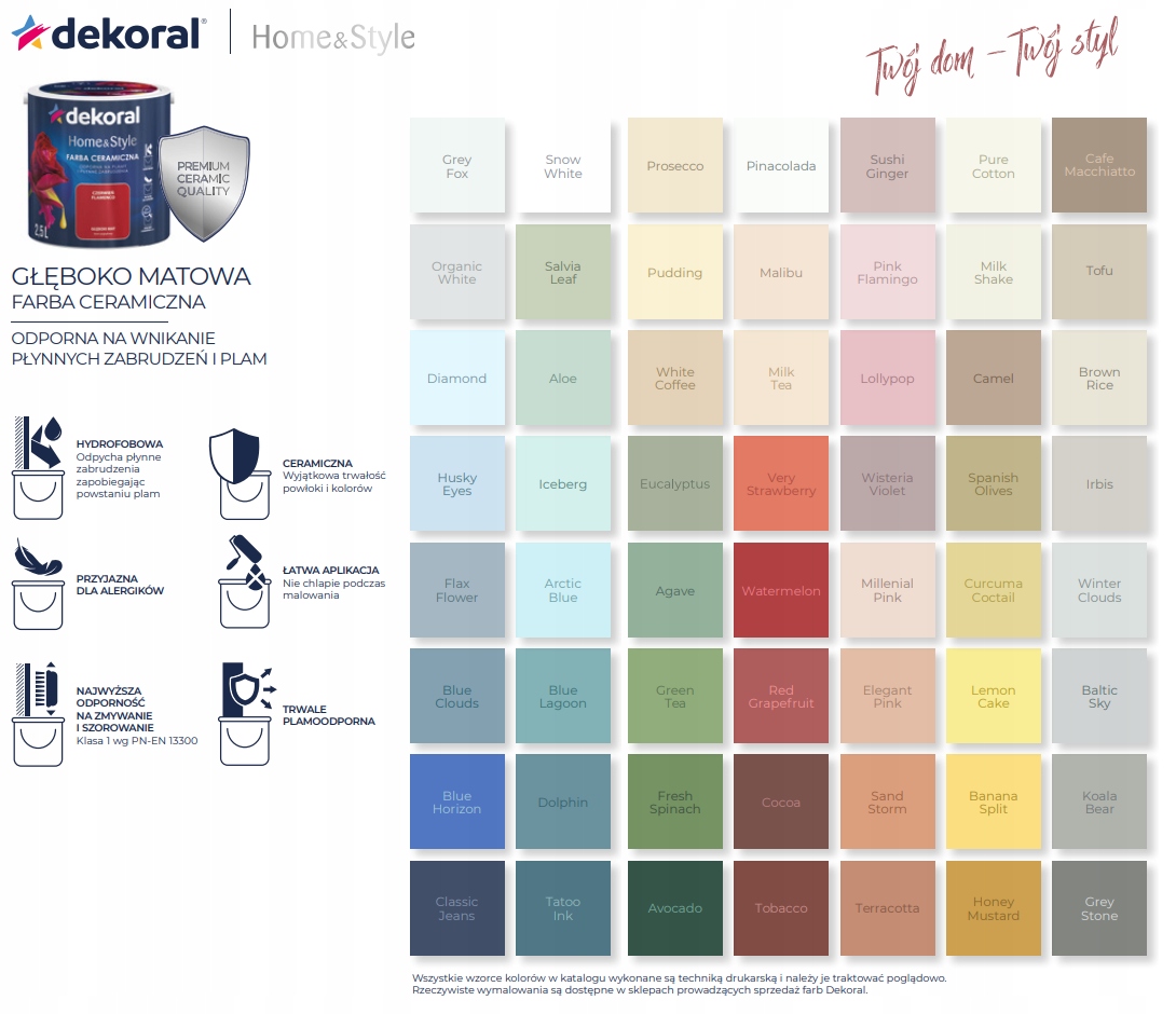 Home&Style to hydrofobowa farba ceramiczna przeznaczona do malowania ścian wewnętrznych i sufitów, tworząca głęboko matową, elegancką i trwałą powłokę. Dzięki zastosowaniu innowacyjnych cząsteczek hydrofobowych, farba Home &Style jest odporna na wnikanie płynnych zabrudzeń i plam. Powłoka posiada najwyższą odporność na zmywanie i szorowanie na mokro, zachowując podczas czyszczenia głęboko matowy aspekt wykończenia. Szczególnie polecana jest do malowania pomieszczeń narażonych na zabrudzenia np. ciągi komunikacyjne, korytarze, pomieszczenia prywatne i biurowe, salony i jadalnie oraz pokoje dziecięce, a także w obiektach użyteczności publicznej, takich jak szkoły, przedszkola, hotele. Rekomendowana na podłoża wykonane z tynków cementowych, cementowo-wapiennych, powierzchni betonowych, tynków gipsowych, płyt gipsowo-kartonowych, powierzchni pomalowanych farbami emulsyjnymi oraz tapet (w tym tapet z włókna szklanego i na podkładzie flizelinowym).