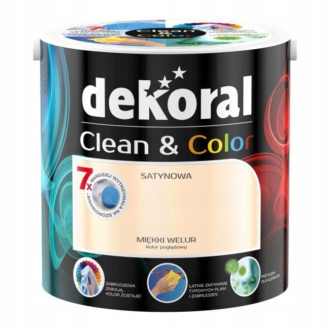 Farba Dekoral z serii CLEAN&COLOR to produkt przeznaczony głównie do użytku wewnętrznego, w ramach dekoracyjnego malowania ścian. Satynowe farby lateksowe z tej serii to świetny wybór do każdego wnętrza, dający niepowtarzalny efekt, dzięki bogatej kompozycji barw. Zaletą farby jest przede wszystkim to, że jest 7x bardziej wytrzymała niż standardowe farby. Dodatkowo charakteryzuje ją łatwość usuwania powstałych zabrudzeń, przyjazna alergikom, doskonałe krycie powierzchni oraz wysoka odporność na szorowanie.