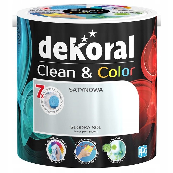 Farba Dekoral z serii CLEAN&COLOR to produkt przeznaczony głównie do użytku wewnętrznego, w ramach dekoracyjnego malowania ścian. Satynowe farby lateksowe z tej serii to świetny wybór do każdego wnętrza, dający niepowtarzalny efekt, dzięki bogatej kompozycji barw. Zaletą farby jest przede wszystkim to, że jest 7x bardziej wytrzymała niż standardowe farby. Dodatkowo charakteryzuje ją łatwość usuwania powstałych zabrudzeń, przyjazna alergikom, doskonałe krycie powierzchni oraz wysoka odporność na szorowanie.
