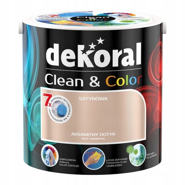 Farba Dekoral z serii CLEAN&COLOR to produkt przeznaczony głównie do użytku wewnętrznego, w ramach dekoracyjnego malowania ścian. Satynowe farby lateksowe z tej serii to świetny wybór do każdego wnętrza, dający niepowtarzalny efekt, dzięki bogatej kompozycji barw. Zaletą farby jest przede wszystkim to, że jest 7x bardziej wytrzymała niż standardowe farby. Dodatkowo charakteryzuje ją łatwość usuwania powstałych zabrudzeń, przyjazna alergikom, doskonałe krycie powierzchni oraz wysoka odporność na szorowanie.