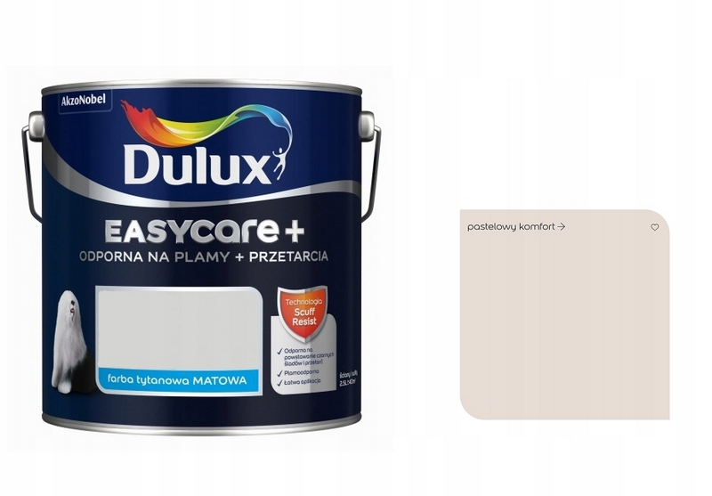 Dulux EasyCare+ to innowacyjna farba lateksowa o właściwościach tytanowych, zapewniających nadzwyczajną wytrzymałość mechaniczną. Tworzy wyjątkowo trwałą powłokę, odporną na powstawanie czarnych śladów i przetarć, które pojawiają się na ścianie w wyniku uderzenia lub zarysowania. Technologia Scuff Resist tworzy powłoki o mikrosferycznej strukturze, które ograniczają tarcie powstałe w czasie uderzenia i przesuwania przedmiotami z gumy, plastiku lub drewna.