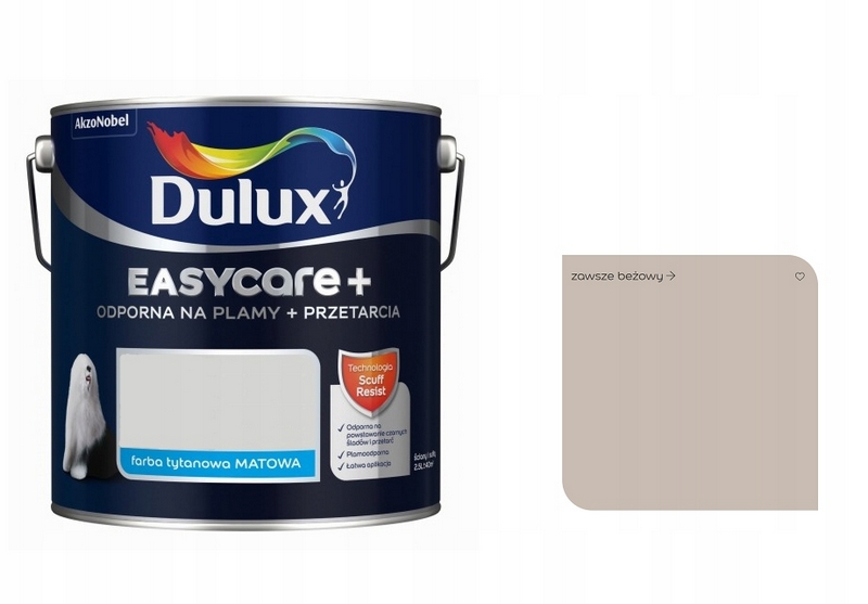 Dulux EasyCare+ to innowacyjna farba lateksowa o właściwościach tytanowych, zapewniających nadzwyczajną wytrzymałość mechaniczną. Tworzy wyjątkowo trwałą powłokę, odporną na powstawanie czarnych śladów i przetarć, które pojawiają się na ścianie w wyniku uderzenia lub zarysowania. Technologia Scuff Resist tworzy powłoki o mikrosferycznej strukturze, które ograniczają tarcie powstałe w czasie uderzenia i przesuwania przedmiotami z gumy, plastiku lub drewna.