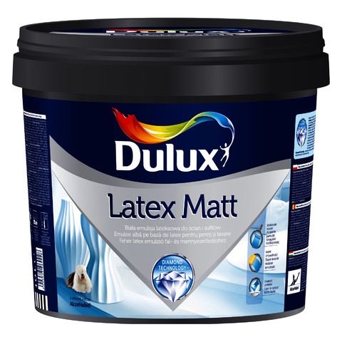 Dulux Latex Matt biała emulsja lateksowa do ścian i sufitów przeznaczona do dekoracyjnego i ochronnego malowania ścian i sufitów wewnątrz pomieszczeń. Emulsja bardzo łatwo się rozprowadza i pozwala na uzyskanie wyjątkowo dużej wydajności przy zachowaniu dobrego krycia, a odpowiednia struktura sprawia, że farba nie chlapie przy malowaniu. Tworzy matową powłokę o doskonałej trwałości, odporną na wielokrotne zmywanie, a jej mikroporowata struktura umożliwia ścianom oddychanie. Dulux Latex Matt może być stosowana na tynki [cementowe i cementowo-wapienne], podłoża gipsowe, płyty kartonowo-gipsowe, tapety papierowe i z włókna szklanego. Emulsja może być stosowana zarówno do pomieszczeń mieszkalnych jak i obiektów użyteczności publicznej np.: biur, szkół, przedszkoli itp.