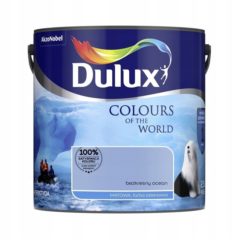 Dulux Kolory Świata to najwyższej jakości lateksowa emulsja do ścian i sufitów o matowym wykończeniu. Dzięki wyjątkowej formule Pigment Pro, zawierającej najwyższej jakości pigmenty, emulsja zapewnia ponadprzeciętne parametry krycia przy zachowaniu trwałości koloru i odporności na zmywanie. Dostępna w 81 kolorach inspirowanych najpiękniejszymi zakątkami świata. Unikalna technologia nowej generacji – Pigment Pro zapewnia ponadprzeciętne krycie przy jednoczesnej odporności na zmywanie i trwałości koloru