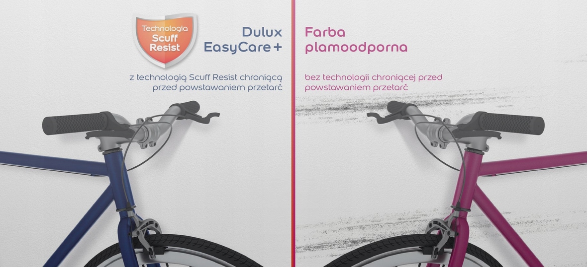 Dulux EasyCare+ to innowacyjna farba lateksowa o właściwościach tytanowych, zapewniających nadzwyczajną wytrzymałość mechaniczną. Tworzy wyjątkowo trwałą powłokę, odporną na powstawanie czarnych śladów i przetarć, które pojawiają się na ścianie w wyniku uderzenia lub zarysowania. Technologia Scuff Resist tworzy powłoki o mikrosferycznej strukturze, które ograniczają tarcie powstałe w czasie uderzenia i przesuwania przedmiotami z gumy, plastiku lub drewna.