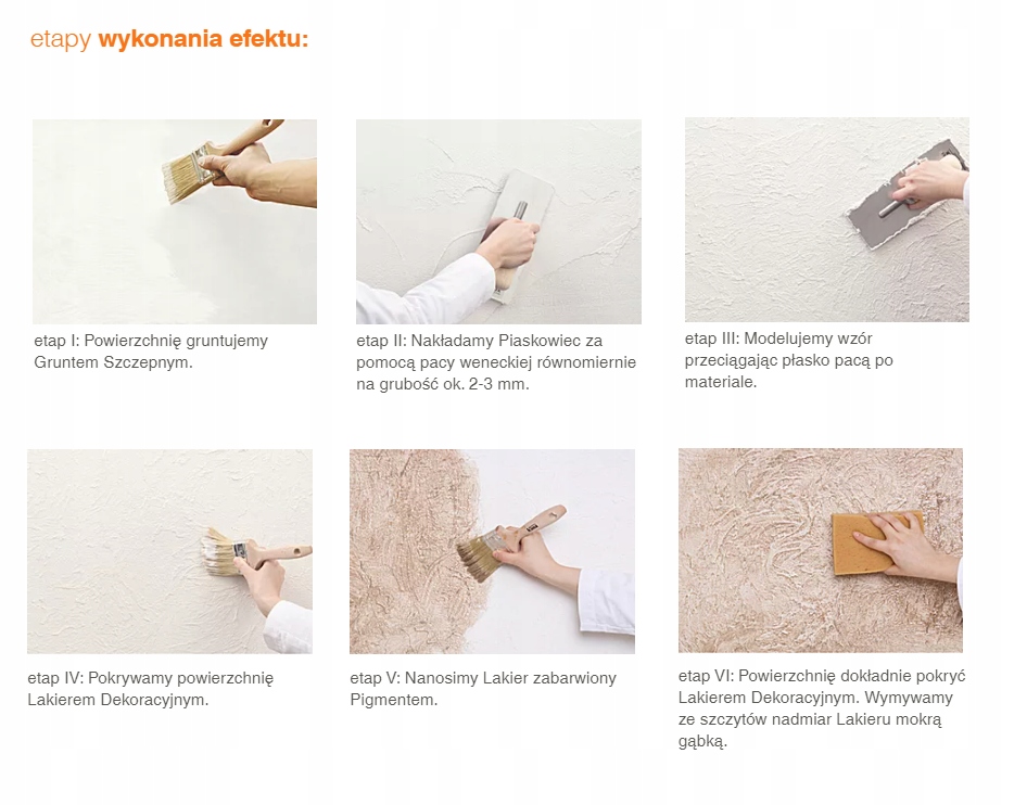 Nakładanie: Przed przystąpieniem do pracy należy zaplanować kolejność i sposób nakładania warstw oraz sprawdzić ostateczny efekt na małej próbce. Tynk należy nakładać za pomocą pacy ze stali nierdzewnej lub plastikowej, modelując według uznania delikatną bądź wyrazistą strukturę. Do nakładania masy w jasnych kolorach zalecamy użycie narzędzi plastikowych. PIASKOWIEC pozwala na tworzenie efektów lub wprowadzenie poprawek w ciągu 5 - 10 min od nałożenia materiału na powierzchnię ściany. Czas ten jest zależny również od parametrów wpływających na schnięcie tynku, chłonności podłoża, od sposobu jego przygotowania, od zamierzonego efektu dekoracyjnego, od doświadczenia wykonawcy, od grubości warstwy, od wybranej metody aplikacyjnej.