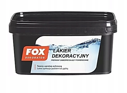 Nakładanie: LAKIER DEKORACYJNY FOX DEKORATOR należy nakładać przy pomocy wałka, pędzla lub narzędzi dekoratorskich. W zależności od podłoża należy nałożyć jedną lub dwie warstwy lakieru. Przed lakierowaniem tynków dekoracyjnych całą powierzchnię odkurzyć miękkim pędzlem. Należy pamiętać, że LAKIER DEKORACYJNY FOX DEKORATOR należy nakładać na suche tynki dekoracyjne. Przy efektach wymagających lakierowania wstępnego, należy LAKIER DEKORACYJNY rozcieńczyć z wodą w stosunku 1:1.