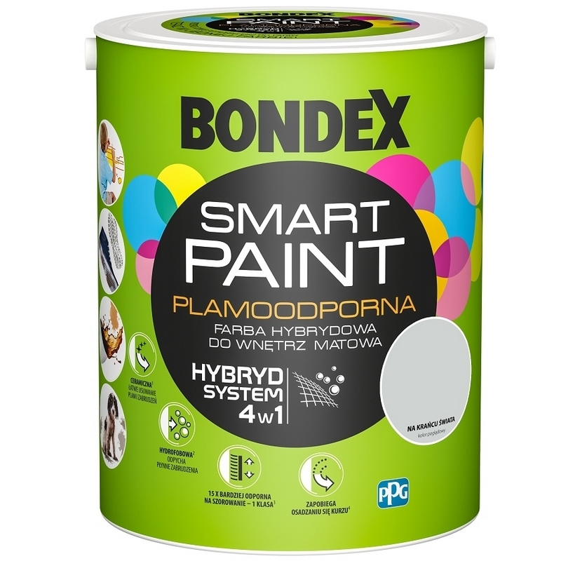 Bondex Smart Paint to najwyższej jakości plamoodporna farba hybrydowa o matowym efekcie wykończenia z innowacyjną formułą HYBRYD SYSTEM 4w1. Synergiczne połączenie wysokogatunkowej dyspersji akrylowej, wysokiej jakości wosków i kombinacji innowacyjnych wypełniaczy sferycznych zapewnia ponadprzeciętne właściwości aplikacyjne i użytkowe oraz niespotykaną odporność na zabrudzenia i plamy.