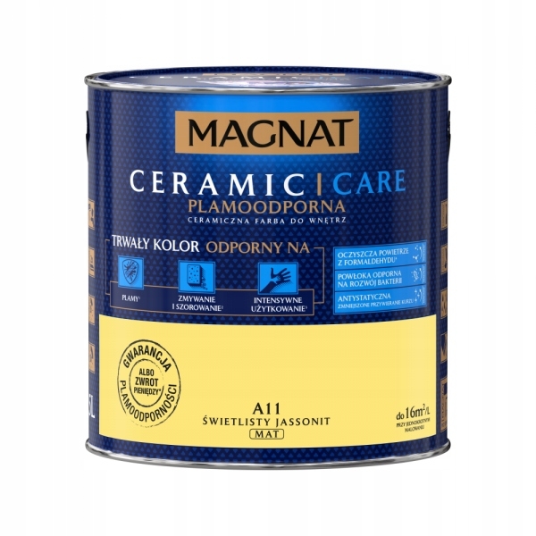 MAGNAT Ceramic Care to farba o przeznaczeniu do pomieszczeń, w których przebywasz najwięcej czasu jak np. sypialnia, pokój dziecięcy, w których może występować w powietrzu niekorzystnie oddziałujący formaldehyd. . Farba jest plamoodporna, antystatycznam a także odporna na rozwój bakterii.