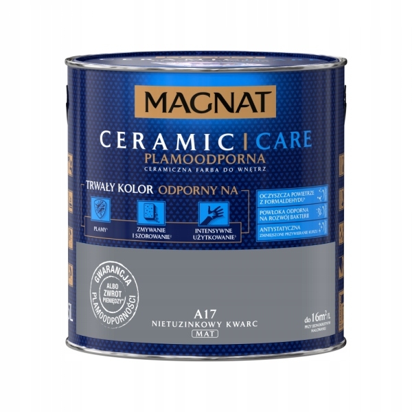 MAGNAT Ceramic Care to farba o przeznaczeniu do pomieszczeń, w których przebywasz najwięcej czasu jak np. sypialnia, pokój dziecięcy, w których może występować w powietrzu niekorzystnie oddziałujący formaldehyd. . Farba jest plamoodporna, antystatycznam a także odporna na rozwój bakterii.