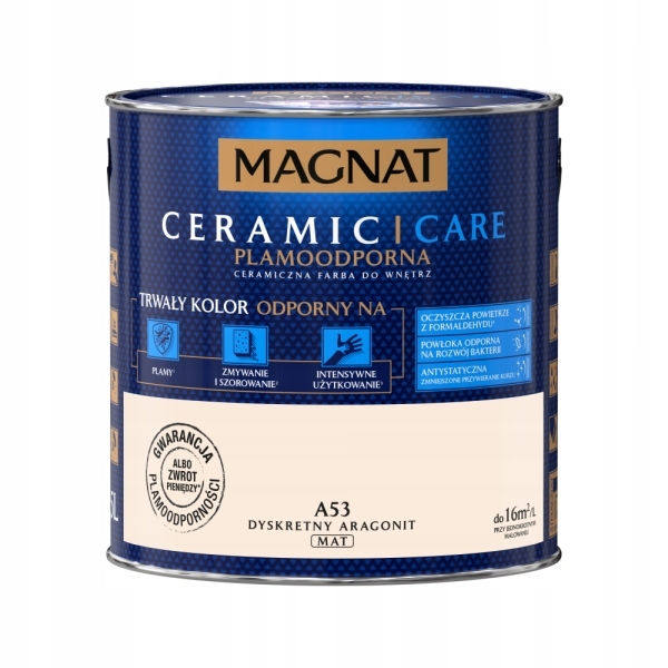 MAGNAT Ceramic Care to farba o przeznaczeniu do pomieszczeń, w których przebywasz najwięcej czasu jak np. sypialnia, pokój dziecięcy, w których może występować w powietrzu niekorzystnie oddziałujący formaldehyd. . Farba jest plamoodporna, antystatycznam a także odporna na rozwój bakterii.