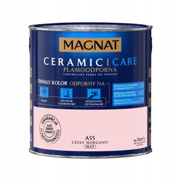 MAGNAT Ceramic Care to farba o przeznaczeniu do pomieszczeń, w których przebywasz najwięcej czasu jak np. sypialnia, pokój dziecięcy, w których może występować w powietrzu niekorzystnie oddziałujący formaldehyd. . Farba jest plamoodporna, antystatycznam a także odporna na rozwój bakterii.