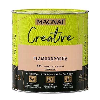 Magnat Creative to farba hybrydowa, łącząca ze sobą dwie właściwości: odporność na płynne zabrudzenia (hydrofobowość) oraz odporność na tłuszcze (oleofobowość). Farba przeznaczona jest do dekoracyjnoochronnego malowania ścian i sufitów z zapraw cementowych, cementowowapiennych, gipsowych, cegły, płyt gipsowokartonowych, drewnianych, drewnopochodnych oraz tapet, również tych z włókna szklanego użytkowanych wewnątrz pomieszczeń.
