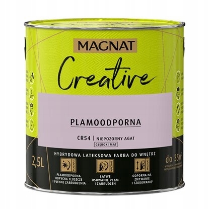 Magnat Creative to farba hybrydowa, łącząca ze sobą dwie właściwości: odporność na płynne zabrudzenia (hydrofobowość) oraz odporność na tłuszcze (oleofobowość). Farba przeznaczona jest do dekoracyjnoochronnego malowania ścian i sufitów z zapraw cementowych, cementowowapiennych, gipsowych, cegły, płyt gipsowokartonowych, drewnianych, drewnopochodnych oraz tapet, również tych z włókna szklanego użytkowanych wewnątrz pomieszczeń.