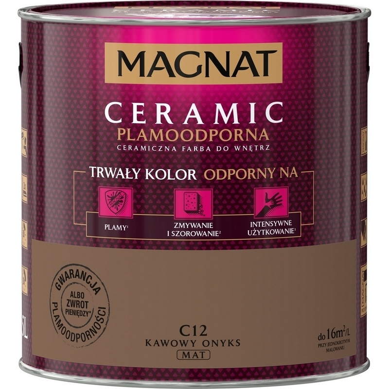 to plamoodporna farba ceramiczna, stworzona na bazie najwyższej jakości żywic i pigmentów z myślą o najbardziej wymagających odbiorcach. Charakteryzuje się ponadprzeciętną odpornością na szorowanie i wielokrotne zmywanie. Powłoki nie absorbują trudnych zabrudzeń oraz są odporne na środki dezynfekujące. Produkt zapewnia doskonałe krycie i wydajność, nie chlapie podczas malowania. MAGNAT Ceramic zapewnia trwałe kolory odporne nawet na intensywną eksploatację i „trudne” plamy, takie jak: ketchup, olej słonecznikowy, pisaki wodne, kredki, szminka, musztarda (usunąć do 1 godziny), kawa, herbata, wino (usunąć do 15 minut) 1. Powłoki farby można zmywać i szorować na mokro2, również przy użyciu niektórych dezynfektantów3. ¹ Badania przeprowadzono po 28 dniach na gładkich, wysezonowanych podłożach dla wymienionych rodzajów plam po upływie wskazanych czasów. Producent zapewnia efekt plamoodporności¹ na gładkich powierzchniach.