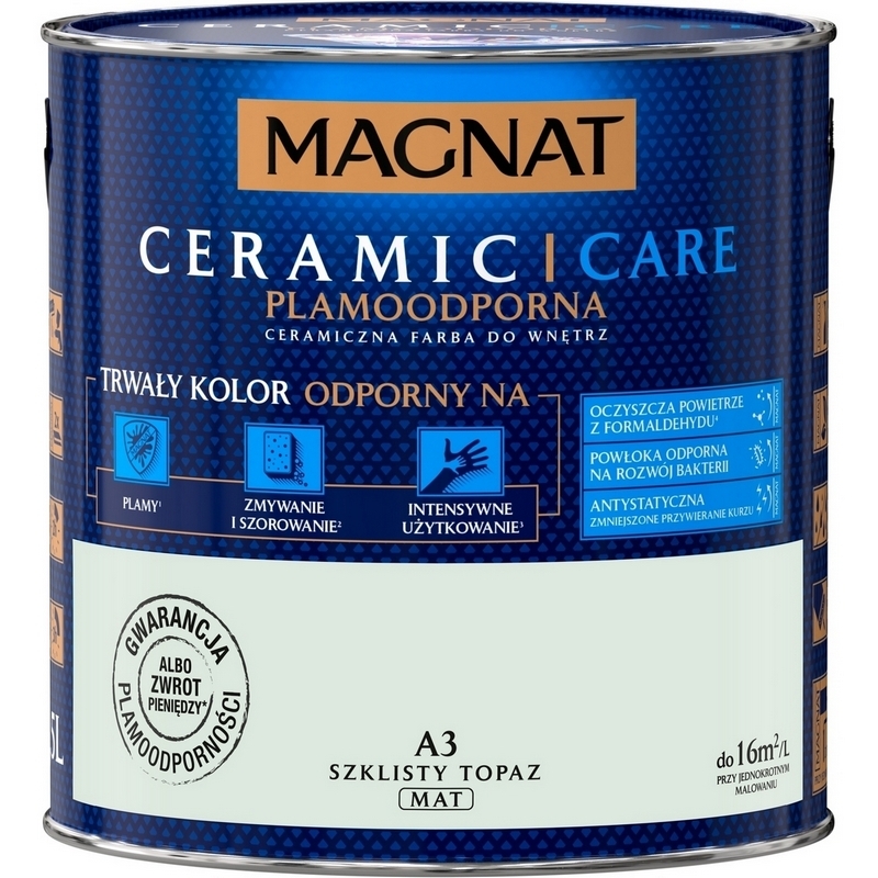 zapewnia redukcję poziomu formaldehydu (nawet o 98%) mogącego występować w powietrzu wewnątrz pomieszczeń. Źródłem formaldehydu mogą być m.in. materiały budowlane, meble, panele podłogowe, dywany, wykładziny. Na podstawie badań laboratoryjnych przeprowadzonych na zlecenie FFIL Śnieżka SA (szczegóły w kartach technicznych na www.magnatfarby.pl). Szybkość i skuteczność procesu redukcji formaldehydu oraz czas jego wiązania przez wymalowanie wykonane farbą MAGNAT CERAMIC CARE zależą od: stężenia formaldehydu w pomieszczeniu, cyrkulacji powietrza, kubatury pomieszczenia, wielkości wymalowanej powierzchni (m2).